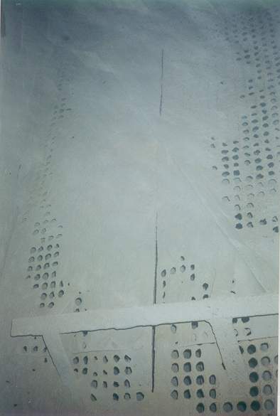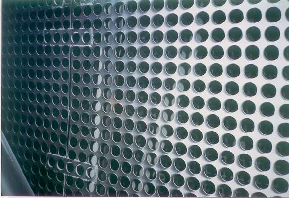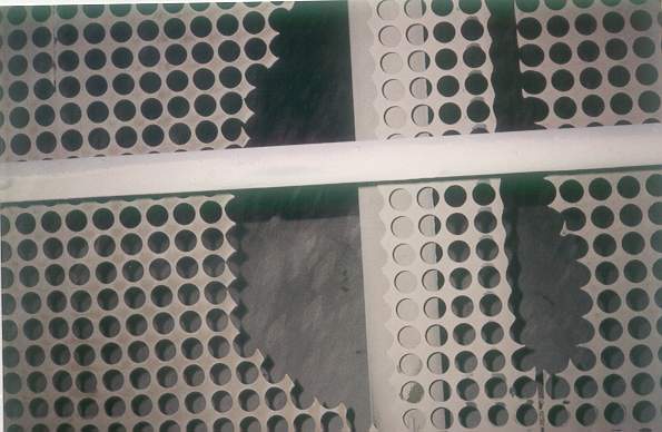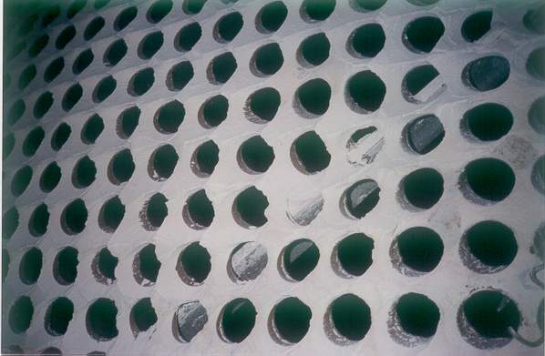 Gas distribution can be evaluated by observing buildup patterns. The buildup on the downstream side of this perforated plate indicates gas flow is expanding downward and to the left. These patterns can be used to devise corrective measures.