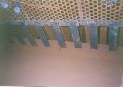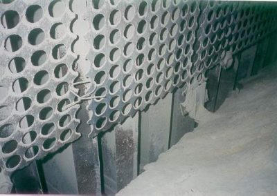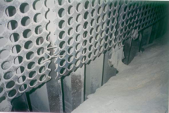 The perforated plate at the inlet flange to the precipitator has been cut along the bottom to promote material flow into the hopper. This has produced a high velocity zone at the bottom of the treatment zone evidenced by scouring of the lower portion of the collecting plates. It also is promoting reentrainment of collected material in the hopper back into the gas stream. BELOW: The installation of a “snowfence” at the bottom of the perforated plate maintains gas distribution while at the same time allowing material to flow into the hoppers.