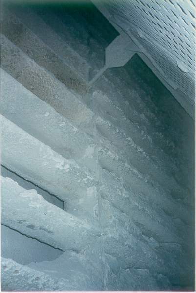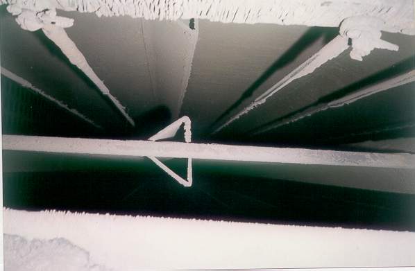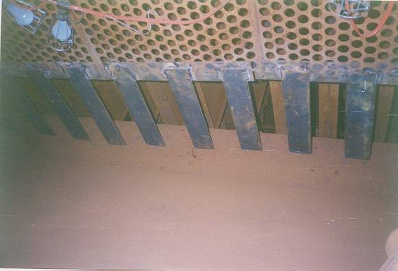 A void created by improperly installed turning vanes, located upstream of the pipe supports and perforated plates, can be seem by the heavy material deposits on the vertical support pipes. This type of buildup indicates little or no flow. One would expect the pipe to be bare metal clean from this angle. A close look at the perforated plate also shows a reverse flow pattern back through the plate. Because the gas is trying to fill this void.