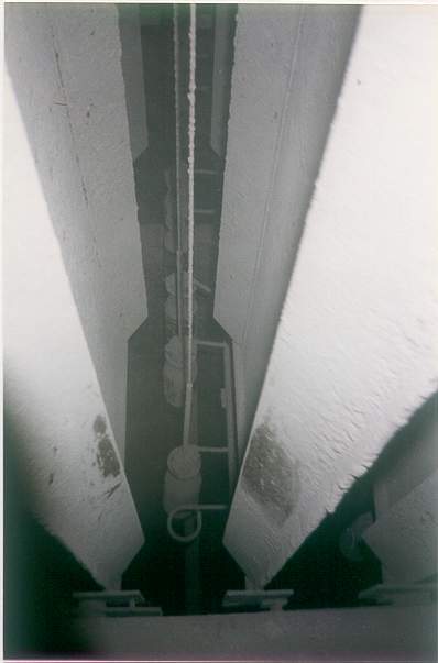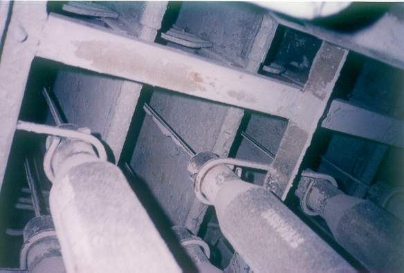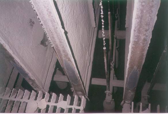 The collecting plates, wire electrodes and weights are scoured clean, indicating a very high gas flow and sneakage along the bottom of the ESP.